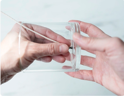 باستخدام ملصق الفتيل، قم بتوسيط قرص مضغوط واحد يحتوي على فتيلًا في كل وعاء.
