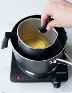 اسكب وزن 1 رطل (16 أونصة أو 454 جم) من رقائق الصويا الطبيعي C3 من كاندلز واي في إبريق السكب. سخني الشمع بغلاية مزدوجة أو طبق ساخن.